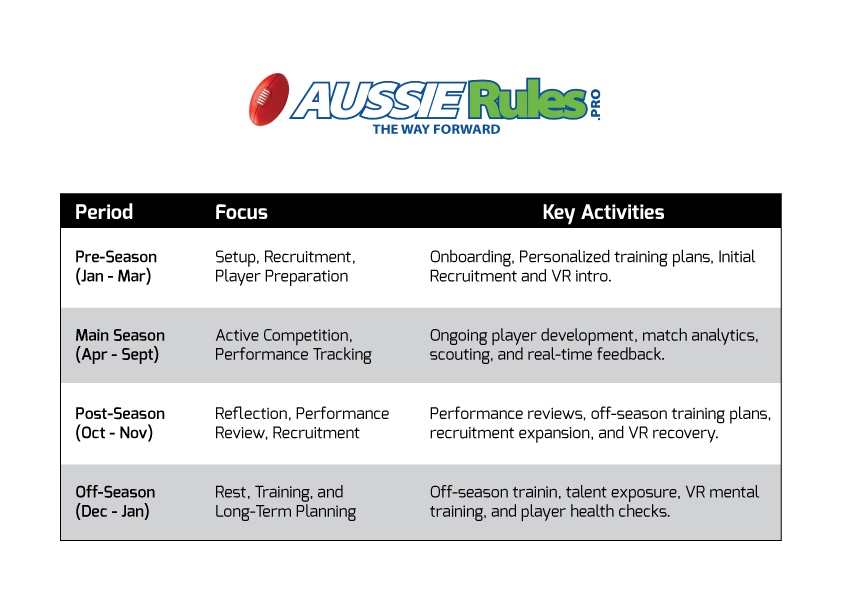 Off-Season (Dec – Jan): The focus shifts to maintaining fitness and preparing for the next cycle. Players receive customized off-season training plans, cognitive wellness checks, and recruitment updates to ensure they remain at the peak of their game.
